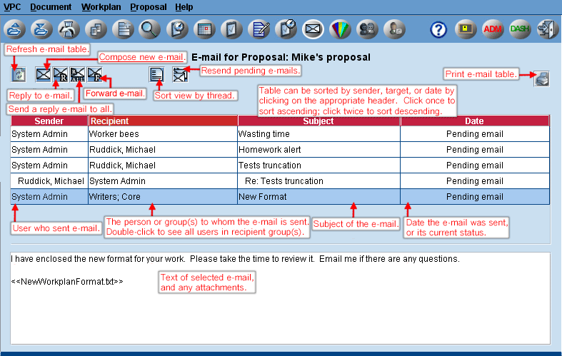 Messages with file attachments, if desired, can be sent from VPC users to each other with a record kept of what was sent, who sent it to whom and when. The E-Mail table shows all previously sent emails. If Users Can View All Emails property is not set for the proposal, then non-admin users can only view emails that they have sent or were sent to them. Click on any email and the text of the message will show in the text box. Use Ctrl C to copy text from the message box to another table or application. The contents of the email table can also be printed. Third Party user access to email is configurable. |